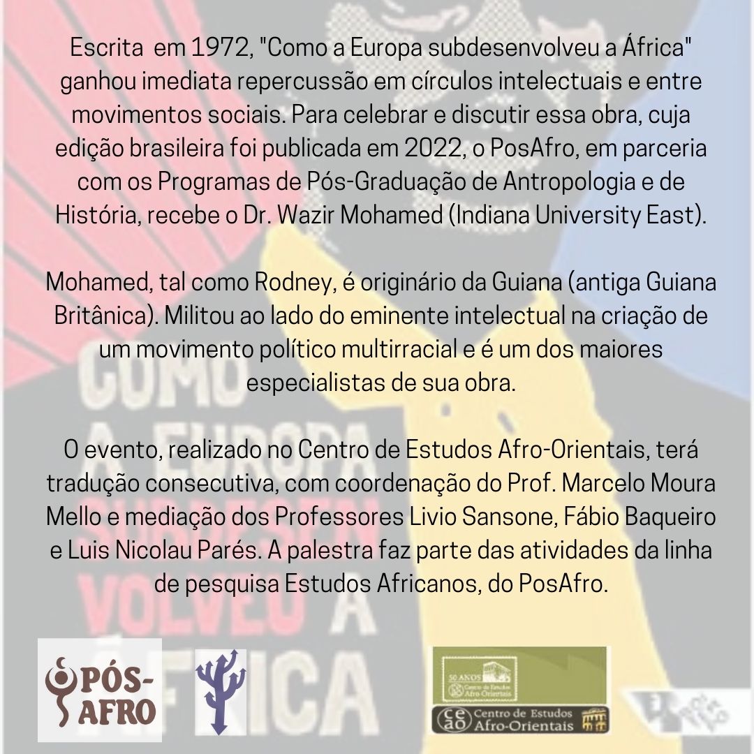 No dia 30/05 às 14h, o Centro de Estudos Afro-Orientais recebe o Prof. Dr. Wazir Mohamed (Indiana University East), para a palestra "Development and Underdevelopment: Walter Rodney's How Europe Underdeveloped Africa and Structural Inequalities in the Former Colonies".
